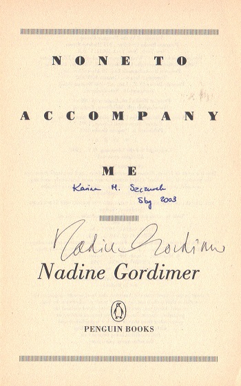 Signature “And then took up her way, breath scrolling out, a signature before her.” The last sentence of Nadine Gordimer’s None to Accompany Me (1994), my favourite of all her novels, still takes my breath away. It is a “biting ebony-blue” winter night when Vera Stark, the narrative’s protagonist, steps into the garden of her new home. Everything is “stripped” outside, bare and clear.