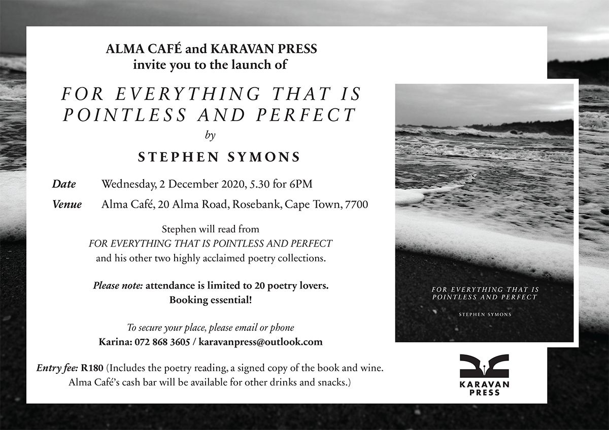 But first, this literary event is coming up and I hope that enough poetry lovers are as starved for a live poetry reading as I am and will come to support us at The Alma Café on 2 December. We will make sure that everyone is seated in such a way that we all feel comfortable and as safe as possible, there will be wine and there will be poetry – a perfect evening, me thinks! And Stephen is not only a wonderful poet, but also a great reader, so we are in for a treat.