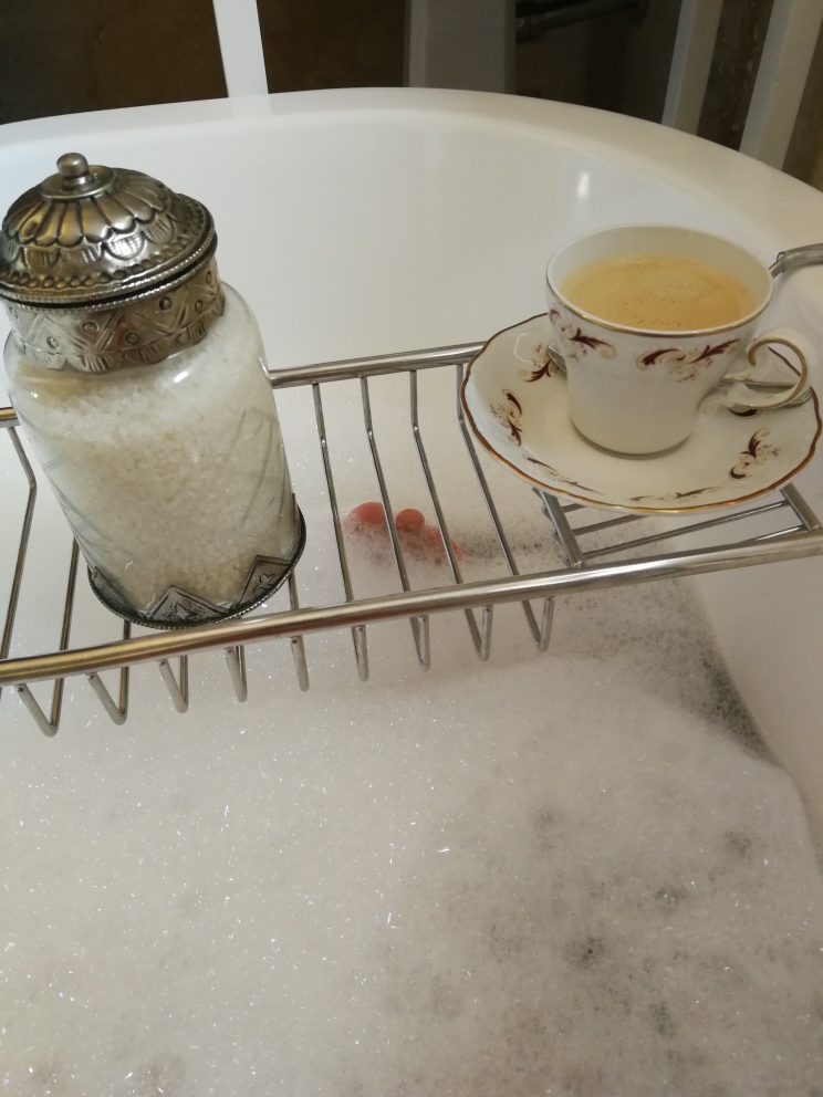 Fortunately, one can read books during a pandemic (at least when your headspace allows it), and the best place for reading is a bubble bath. Add Sunday morning, a gorgeous setting, coffee in a delicate cup and a great new book, and you know how happy I was earlier today.