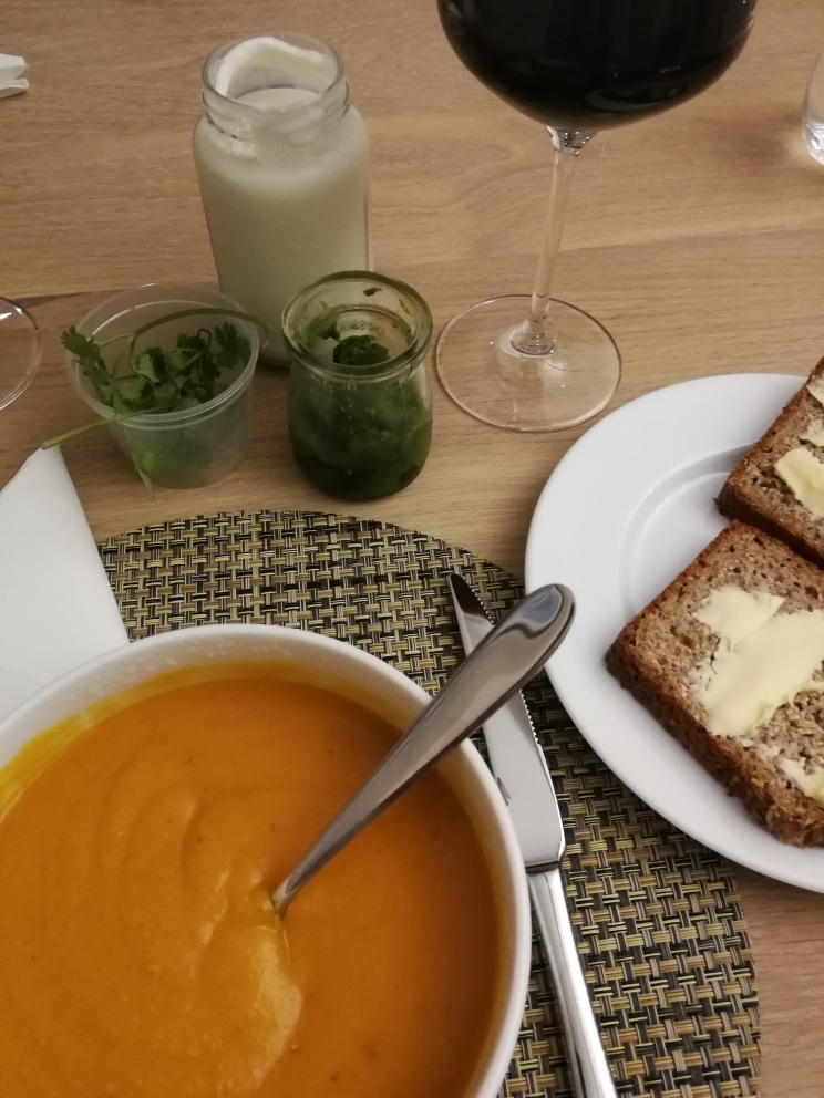 Away for the weekend, and this delicious soup was a gift. We heated it up for dinner. And we ate in pyjamas, all ready for an early night. There was a fire and some lovely wine and just a slow unwinding. Sometimes it is enough to do the simple everyday things in a different place to gain a different perspective on life. And the tension I felt this morning, a feeling of desperate not-coping, is receding.