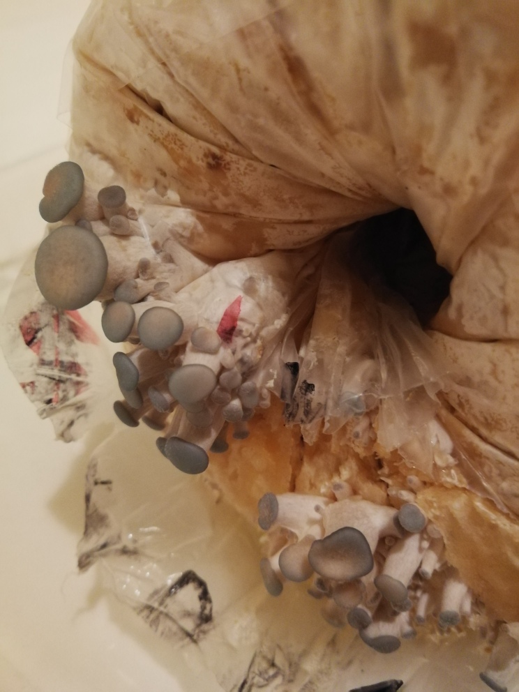 I am growing edible mushrooms – OYSTER mushrooms! This is only my first batch, but the results so far are very encouraging and I might expand my mushroom farming in the near future :) It seems like the perfect autumn enterprise. And today felt like AUTUMN. Rain, fog, darkness, cold and general weather misery. My love made the first fire of the season for us in the evening and it was bliss. He also prepared dinner while I read a book. That is a different level of bliss. It was an altogether lazy afternoon of books and sports on TV. But I worked from about seven a.m. until lunch. It looks like I will be able to relax for most of the day tomorrow. I want to stay in bed and forget about the world. Oysterhood activated.