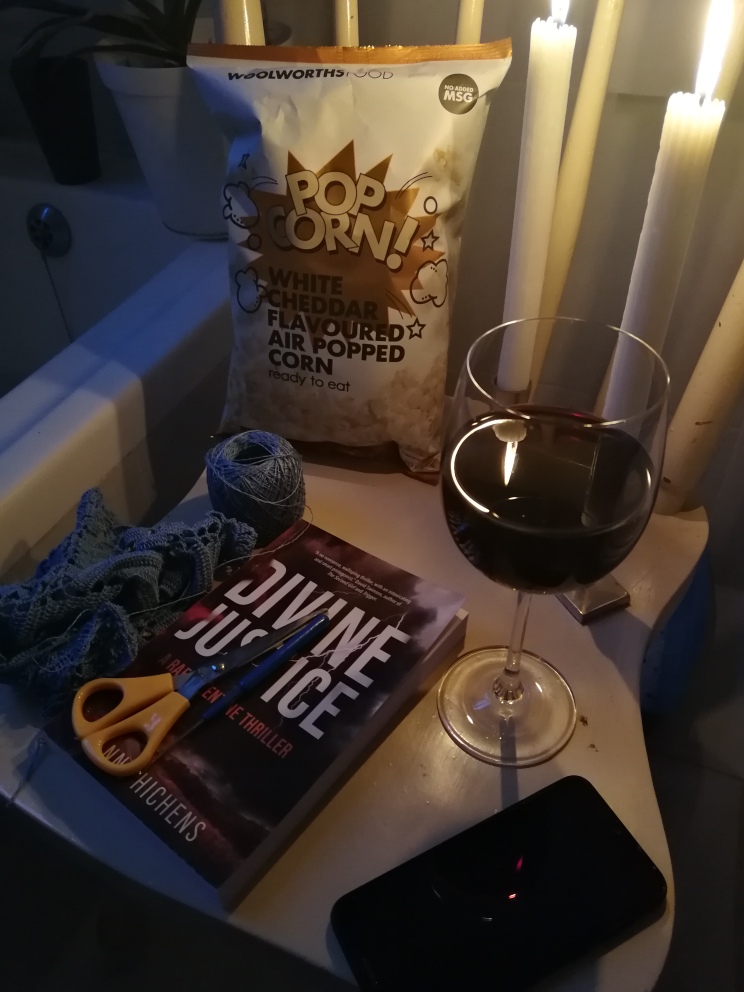 Bloody loadshedding. Fortunately, only for an hour tonight, and I had a plan: I just got into a hot bath with crocheting, a generous glass of wine, a crime novel and popcorn. Glinka sat on another chair next to the bath and kept me company by candlelight. Then, when the power came back on, we had a long Skype chat with Austrian family.