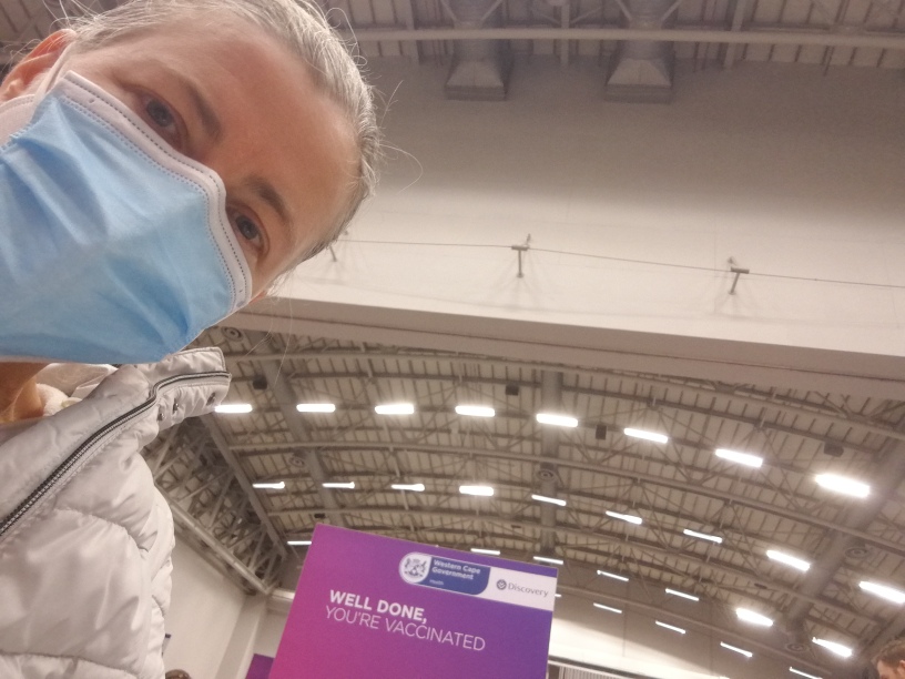 Someone who loves me very much encouraged me to go to the CTICC and get my Covid-19 vaccine as a walk-in. I have become quite weepy lately, but I think I would have had tears of joy and relief in my eyes today one way or another. The sense of taking the first step towards safety – away from suffering and potentially dying because of Covid-19 – was so empowering and overwhelming, I still feel the excitement of it all. And: I. HATE. NEEDLES. (The nurse administering my vaccine was very understanding and made sure that I did not see the needle at any stage.)