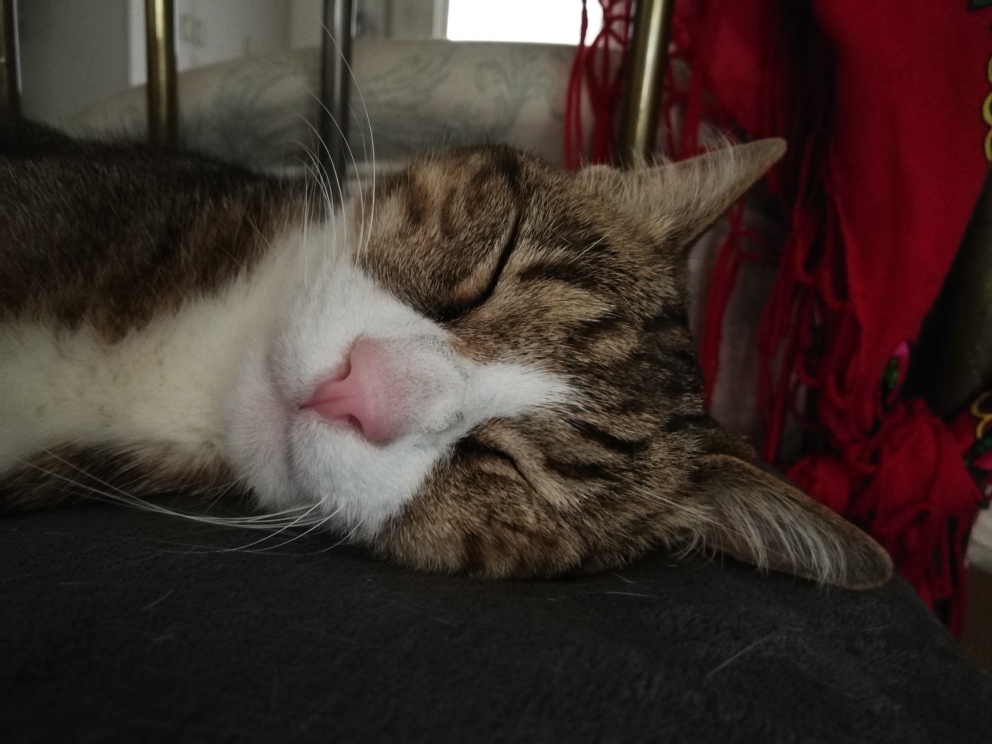 Salieri hasn’t been herself in the last few days, but she is eating again with a little bit of help and definitely enjoying her long sleeps, especially when she can be on my lap.