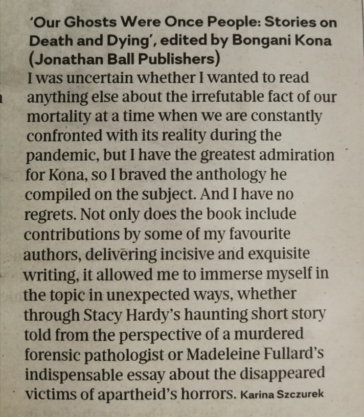 I was uncertain whether I wanted to read anything else about the irrefutable fact of our mortality at a time when we were constantly confronted with its reality during the pandemic, but I have the greatest admiration for writer/editor Bongani Kona, so I braved the anthology he compiled on the subject this year, Our Ghosts Were Once People: Stories on Death and Dying. And I have no regrets. Not only does the book include contributions by some of my favourite authors, delivering incisive and exquisite writing – Mary Watson, Hedley Twidle, Tariq Hoosen, Dawn Garisch, Musawenkosi Khanyile, Karin Schimke, Shubnum Khan and Nick Mulgrew among them – but allowed me to immerse myself in the topic in unexpected ways, whether through Stacy Hardy’s haunting short story told from the perspective of a murdered forensic pathologist or Madeleine Fullard’s indispensable essay about the disappeared victims of apartheid’s horrors. I am deeply grateful to the writers for this remarkable book which feels like essential reading for our complex present.