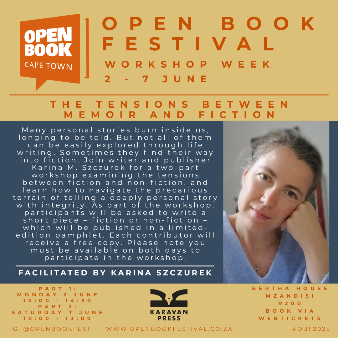 Explore the delicate balance between memoir and fiction with me, Karina Szczurek, in a two-part workshop. Your work could be published! Space is limited, so book now:
