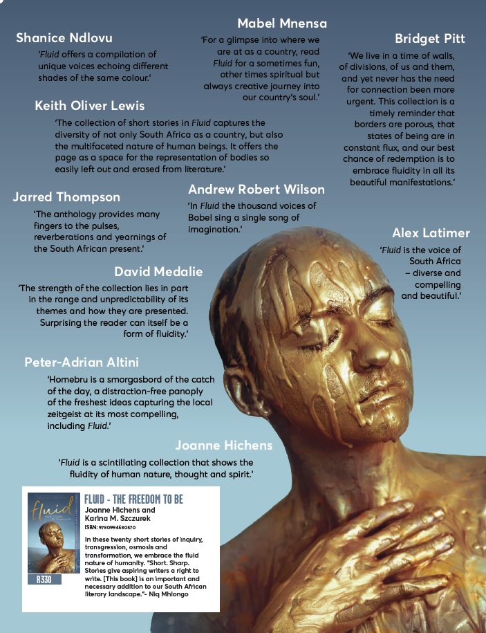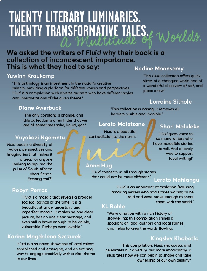 Short.Sharp.Stories is a proven platform showcasing top and emerging South African writers. However, we welcome all writers over the age of 18, no matter your background or experience, to send in short stories. FLUID seeks to engage fictional expression around identity, culture and society.