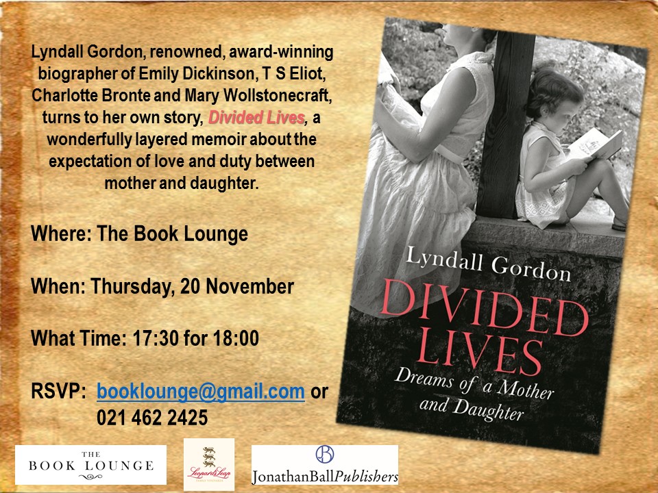Anybody who reads me will know how much I admire Lyndall Gordon‘s work. Her latest, Divided Lives (Virago, 2014), raises my admiration to another level. Just looking at the shelf where I keep all her wise, powerful biographies and memoirs reassures me. She has brought so much sustenance and joy into my life as a reader, writer and woman that I am certain I would be a very different, and much poorer, Karina today without having encountered her books. May there be many more to come.