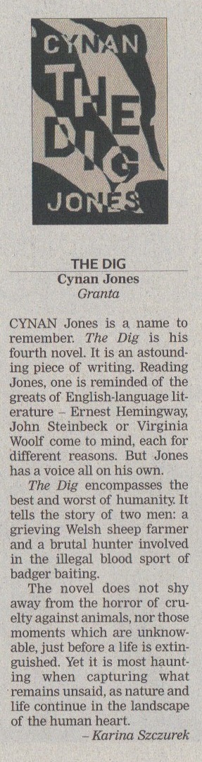 The Dig_book markCynan Jones is a name to remember. The Dig is his fourth novel. It is an astounding piece of writing. Reading Jones one is reminded of the greats of English-language literature – Hemingway, Steinbeck or Virginia Woolf come to mind, each for different reasons. But Jones has a voice all his own. His prose is pure muscle and yet it conveys the most delicate of impressions and emotions. The Dig encompasses the best and worst of humanity. It tells the story of two men: a grieving Welsh sheep farmer and a brutal hunter involved in the illegal blood sport of badger baiting. The novel does not shy away from the horror of cruelty against animals, nor those moments which are unknowable, just before a life is extinguished. Yet it is most haunting when capturing what remains unsaid, as nature and life continue in the landscape of the human heart.